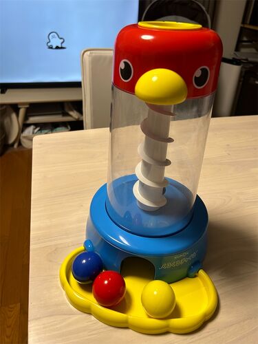 GW2日目。 GWらしく今日は朝から大雨だったことから、自宅で赤ちゃんと遊んだ。 あと10日で1歳を迎える赤ちゃんが夢中なのがこのおもちゃだ。 見たことがある人も多いかもしれない。 上部の穴にボールを入れると、本体内部の螺旋状のレールを通って転がって…
